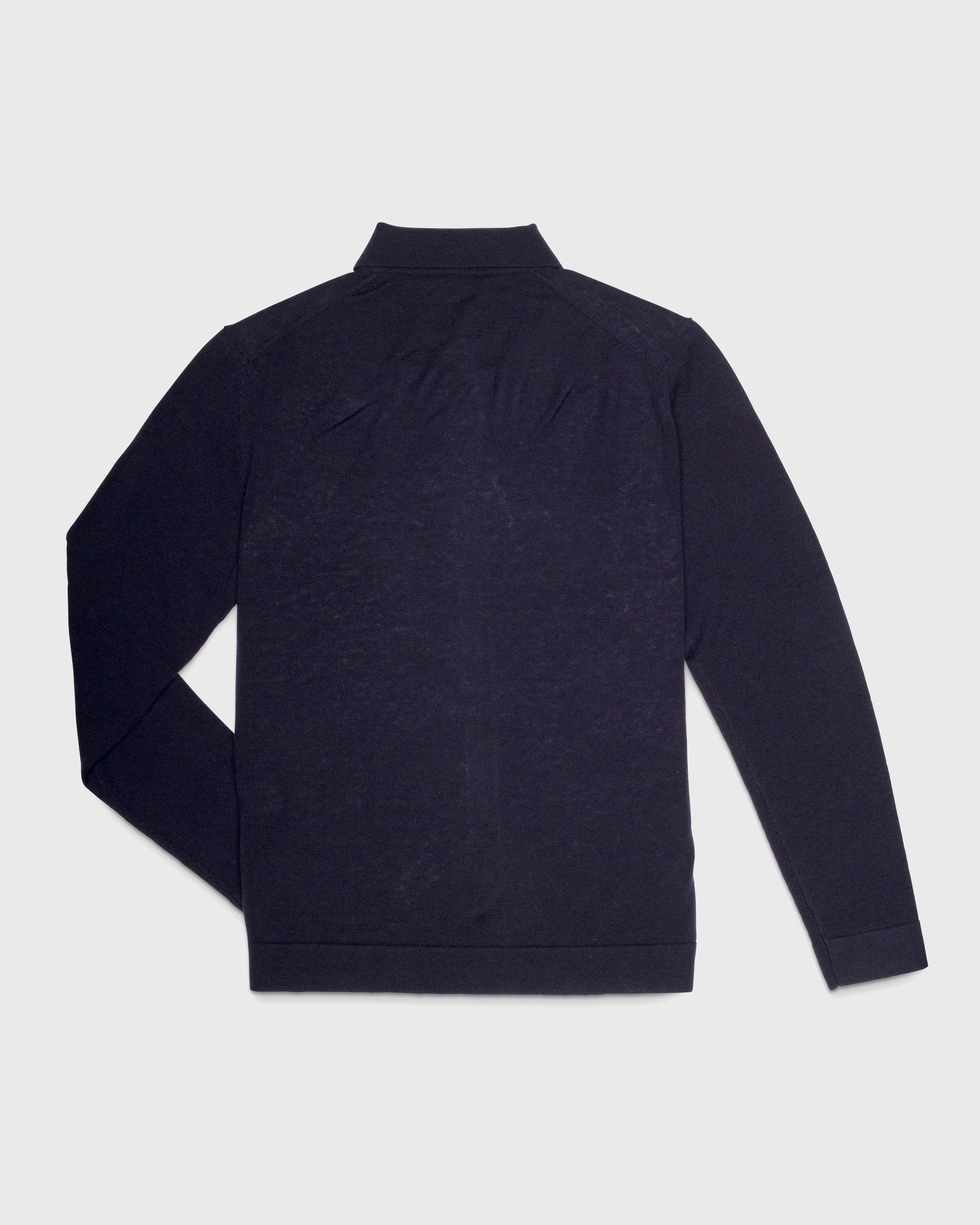 90% Merino Wool / 10% Cashmere Athletic Fit Long Sleeve Polo Button Front Placket Bias cut Underarm w/ our proprietary 'MoRE|ERoM' (Extended Range of Motion) design  Rib Cuff Recycled HD-Damask and Satin labels UPF 50+